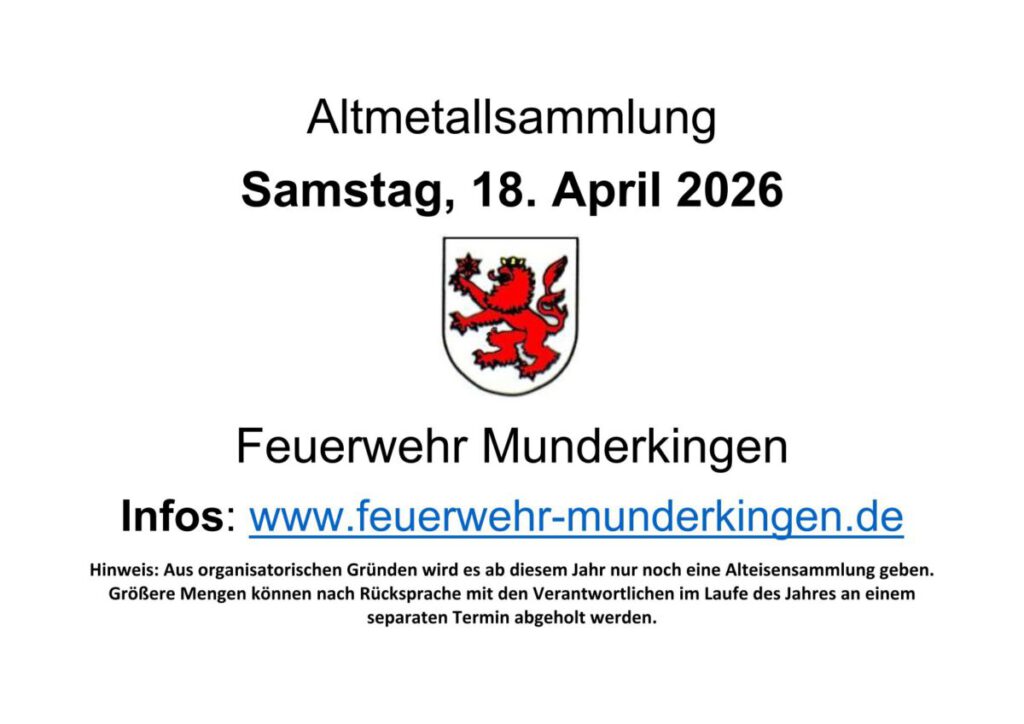 Liebe Mitbürger und Mitbürgerinnen, am Samstag, 18. April führt die Feuerwehr Munderkingen die diesjährige Alteisensammlung durch. An diesem Tag werden wir durch die Straßen der Stadt Munderkingen und Algershofen fahren und Ihren bereitgestellten Metallschrott einsammeln. Alle Straßen werden nur einmalig abgefahren, daher sollte alles bereits um 8.00 Uhr zur Abholung bereitstehen. Hinweis: Aus organisatorischen Gründen wird […]